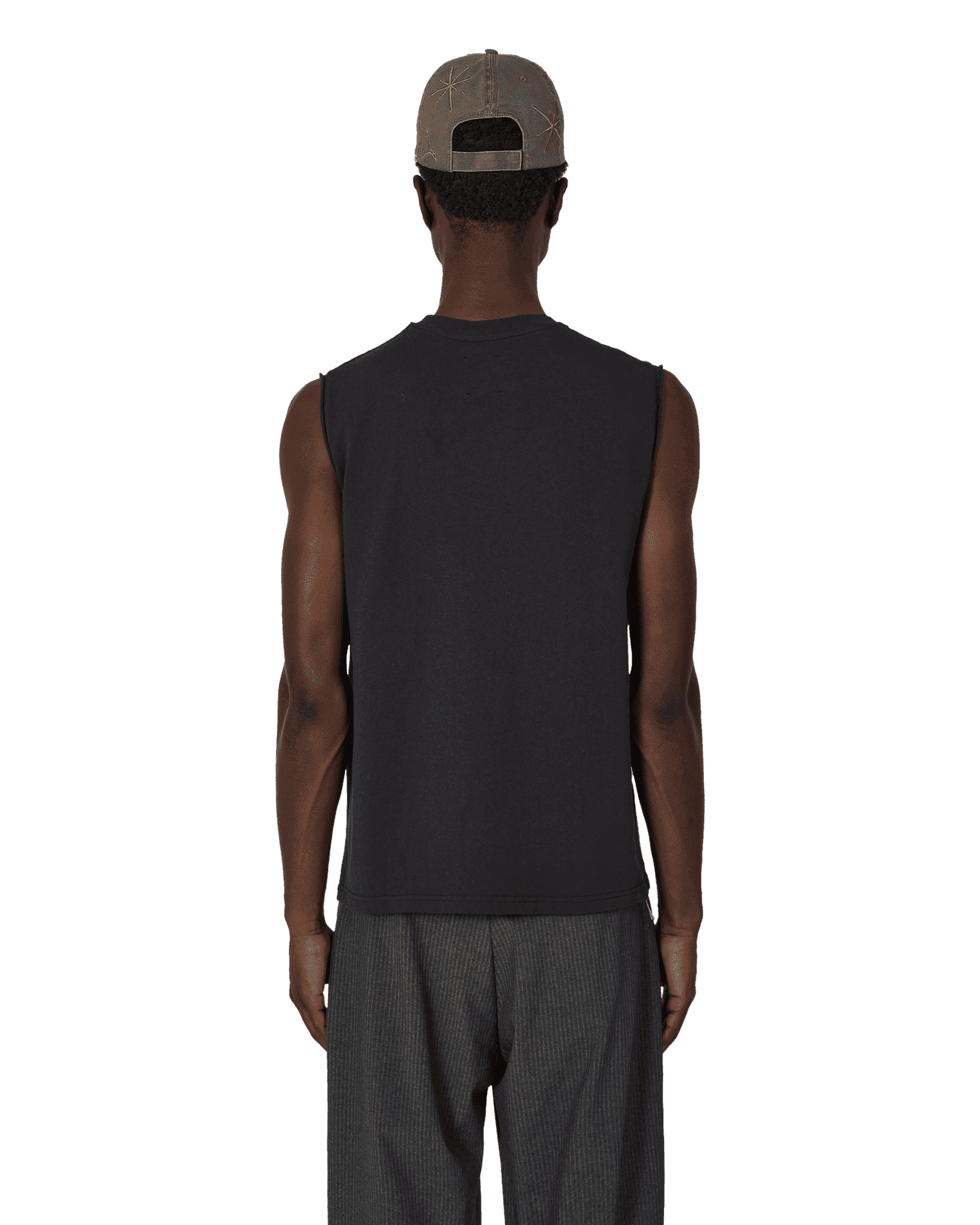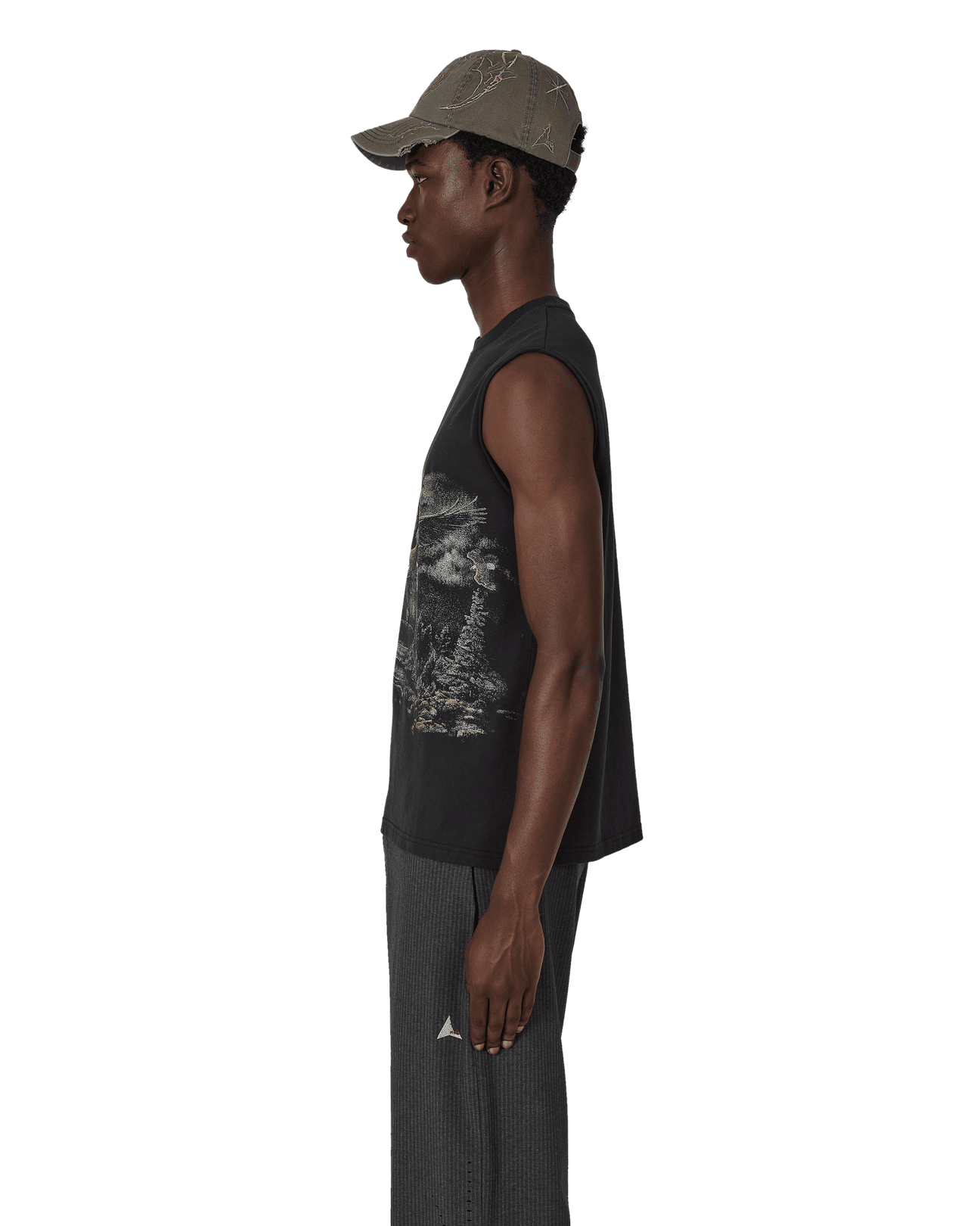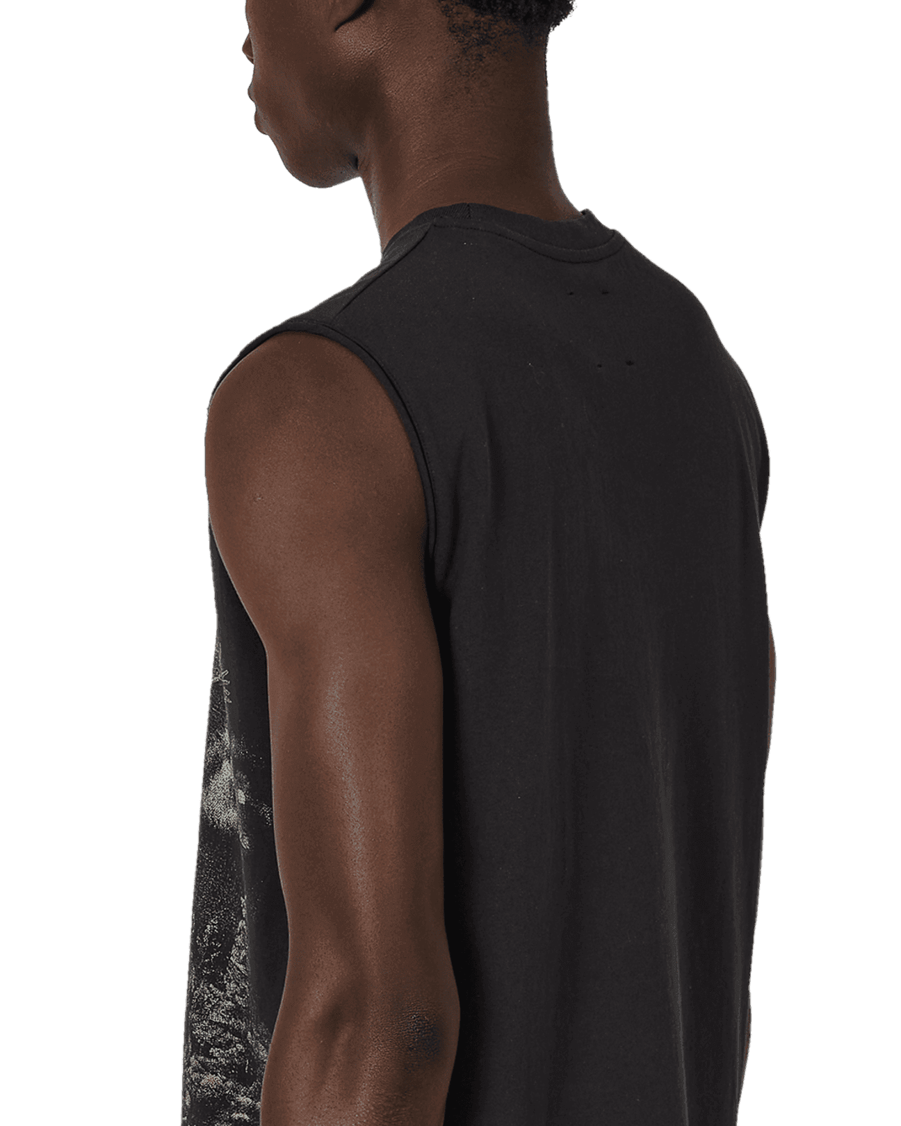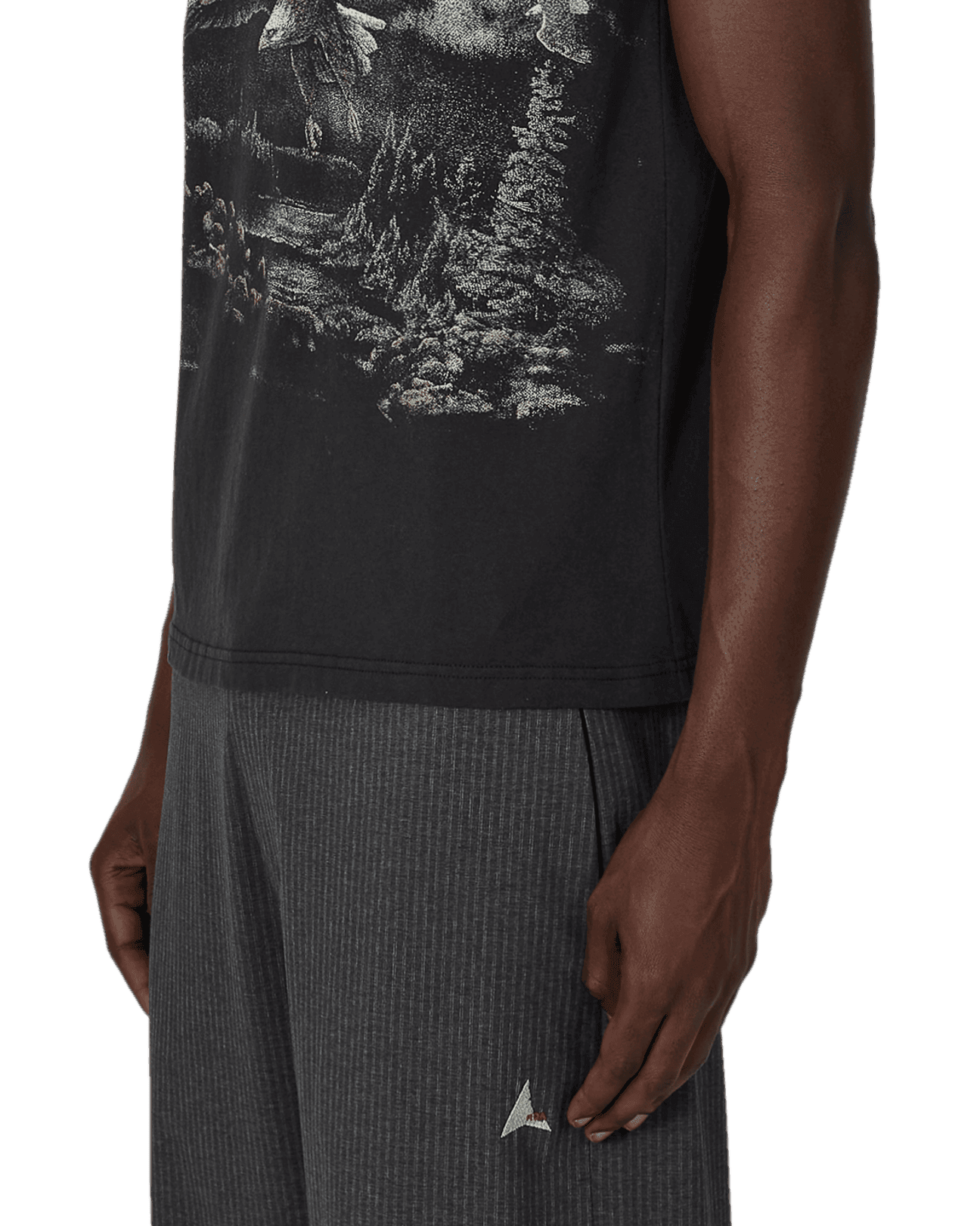Sleeveless t-shirt made of organic cotton jersey, washed black color. Boxy and comfortable fit. Very soft, lightweight, and breathable fabric. Printed contrasting graphic on the front. Ribbed collar.