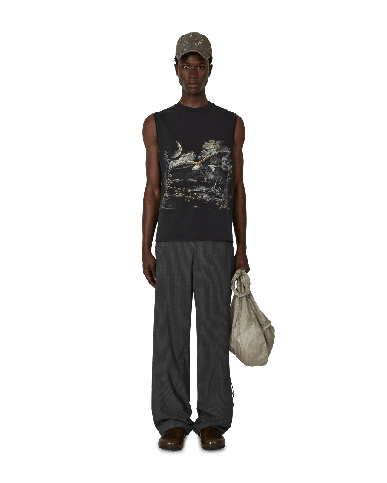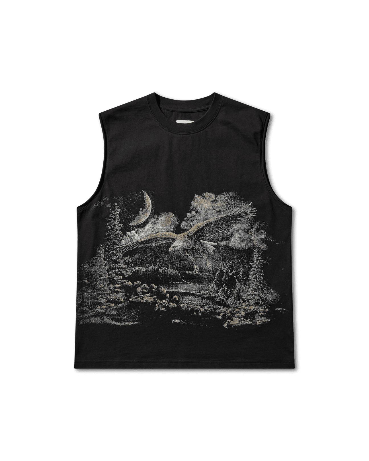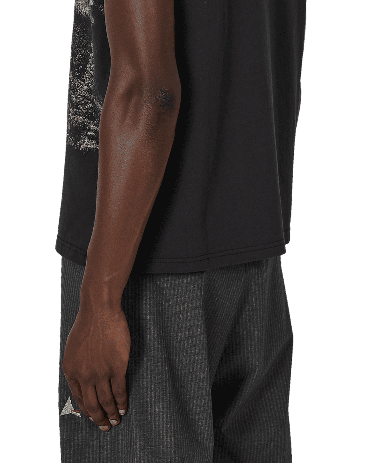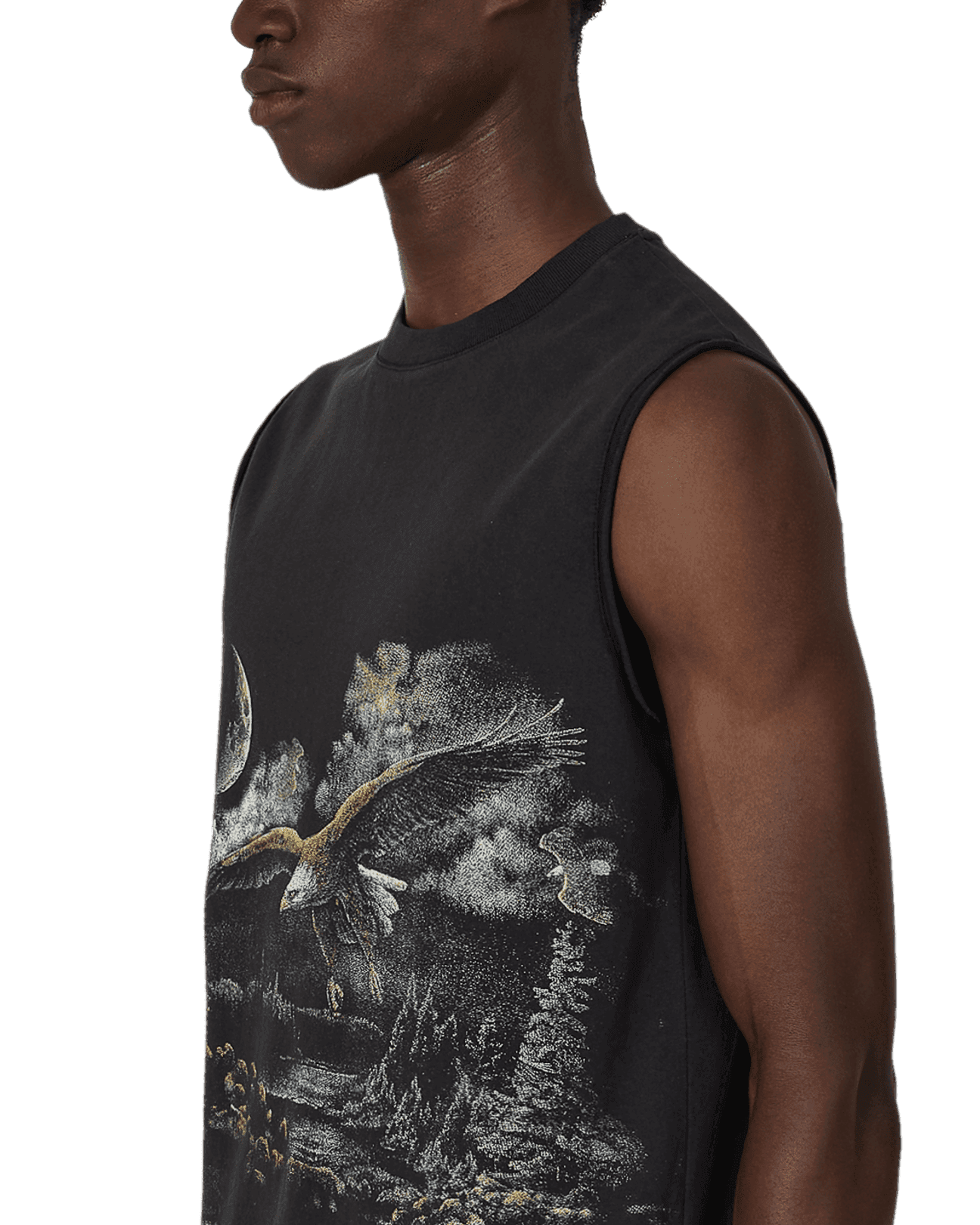 Sleeveless t-shirt made of organic cotton jersey, washed black color. Boxy and comfortable fit. Very soft, lightweight, and breathable fabric. Printed contrasting graphic on the front. Ribbed collar.