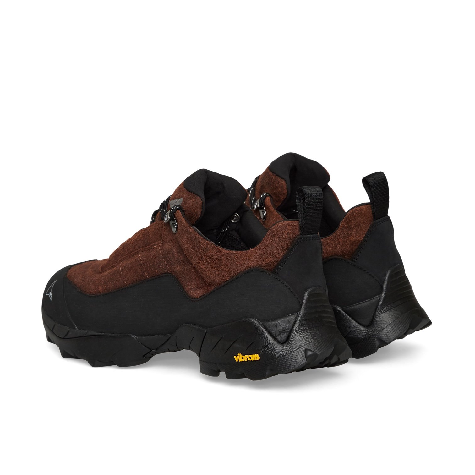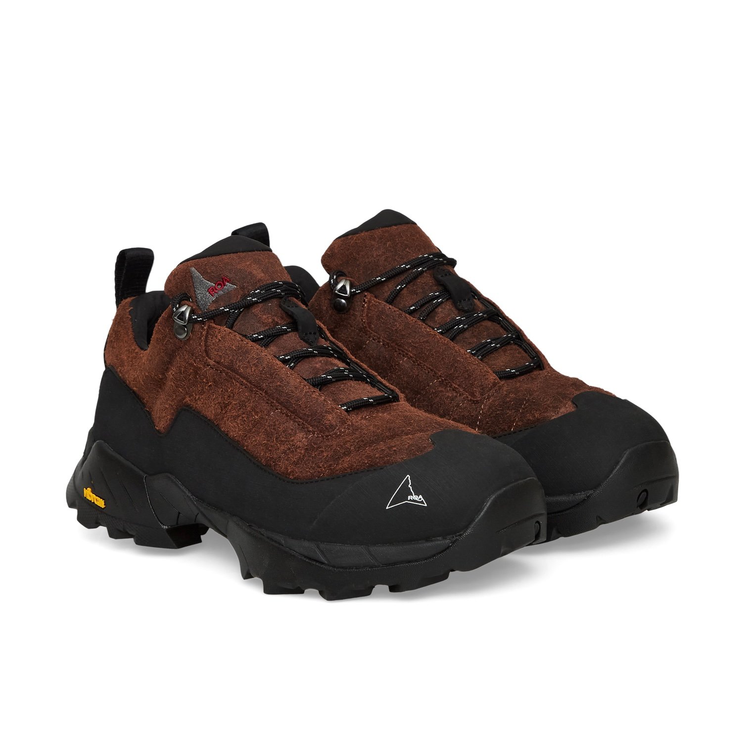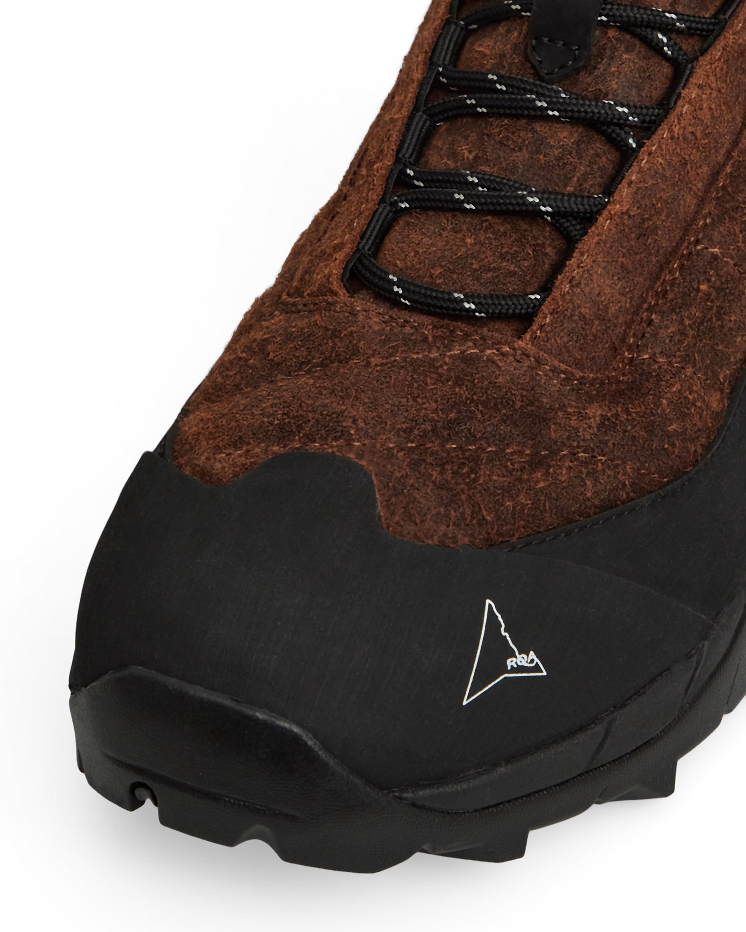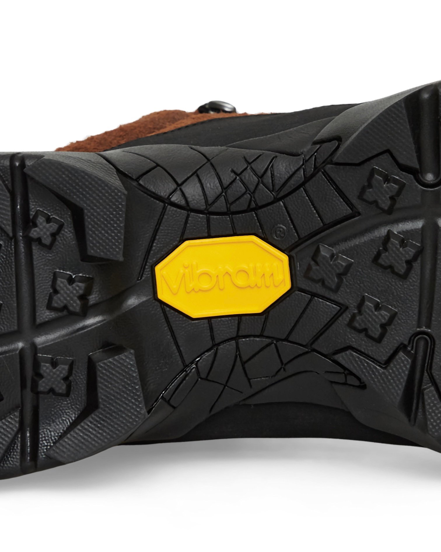 ROA’s signature hybrid silhouette combines the features of an approach shoe with those of a contemporary athletic shoe. Featuring long hair suede with a wax impregnation treatment on the upper to ensure waterproofing, each shoe is unique and different from each other since is treated by hand. The leather upper provides durability, and is combined with a custom Vibram® Megagrip rubber outsoles for traction, a rubberized toe cap for enhanced protection, and stitched rubber foxing to secure it.