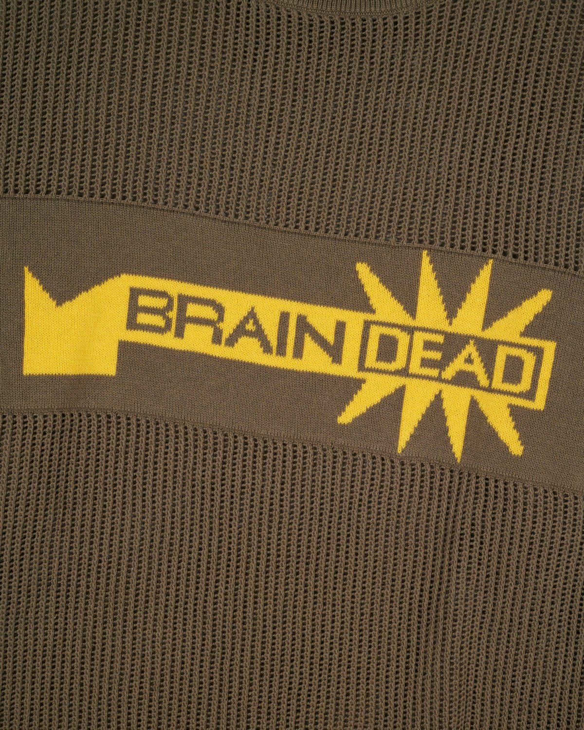 Our open knit sweater with custom intarsia chest panel featuring Brain Dead typography, plus a contrast stripe along the sleeve and shoulder.