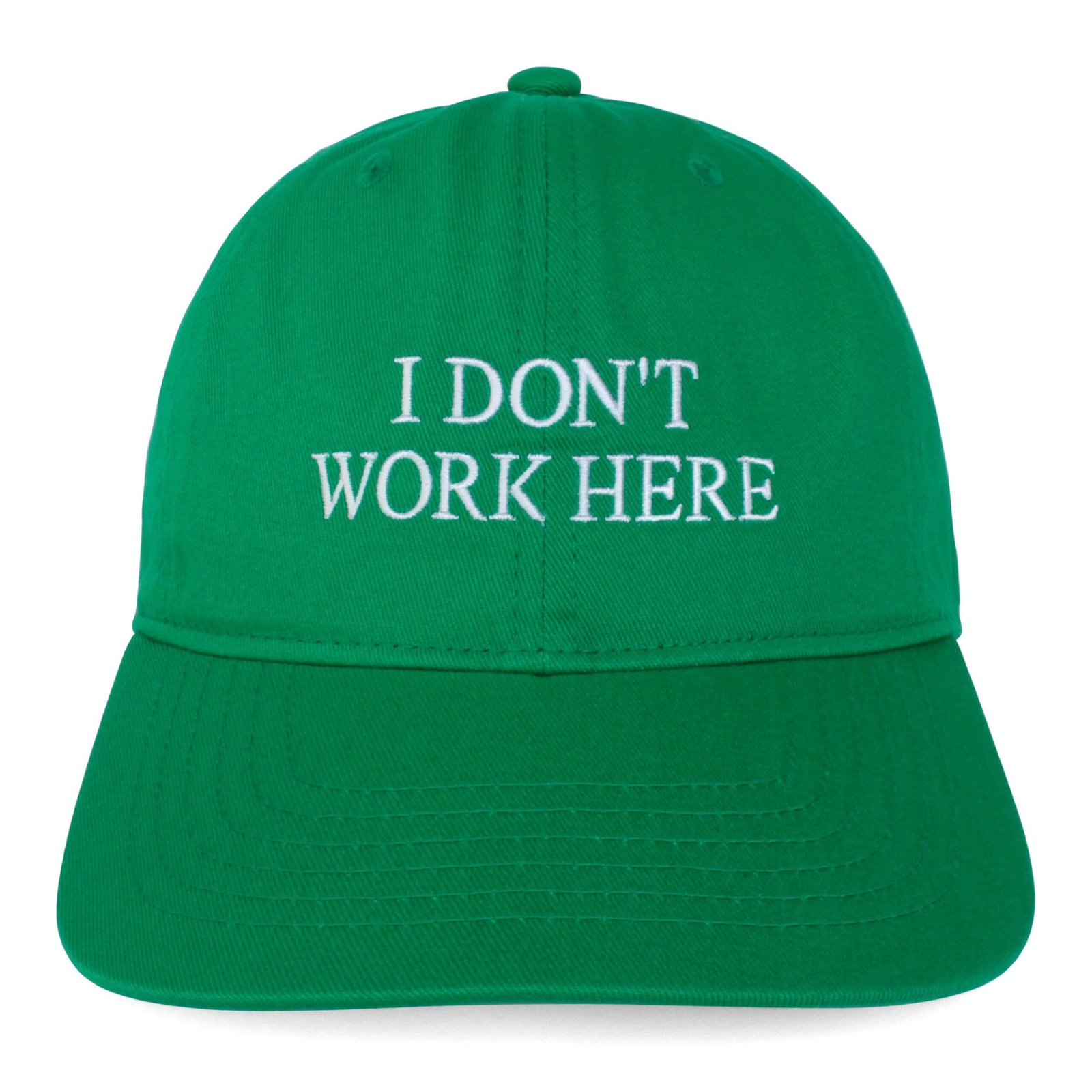 100% organic cotton IDEA hat. I DON'T WORK HERE on the front. SORRY on the back. Green coloured all organic cotton classic unstructured six panel hat. Eco conscious 🙂