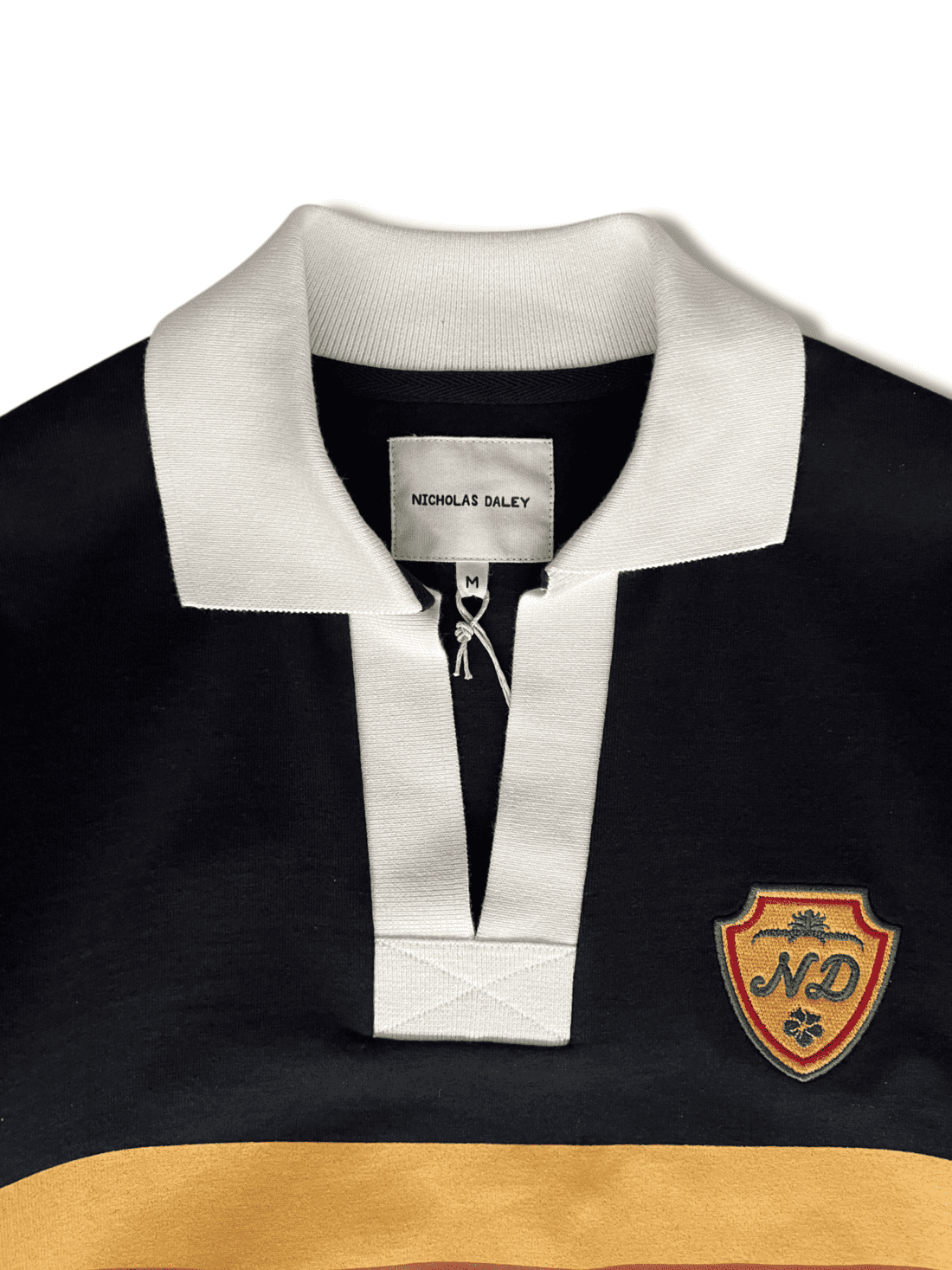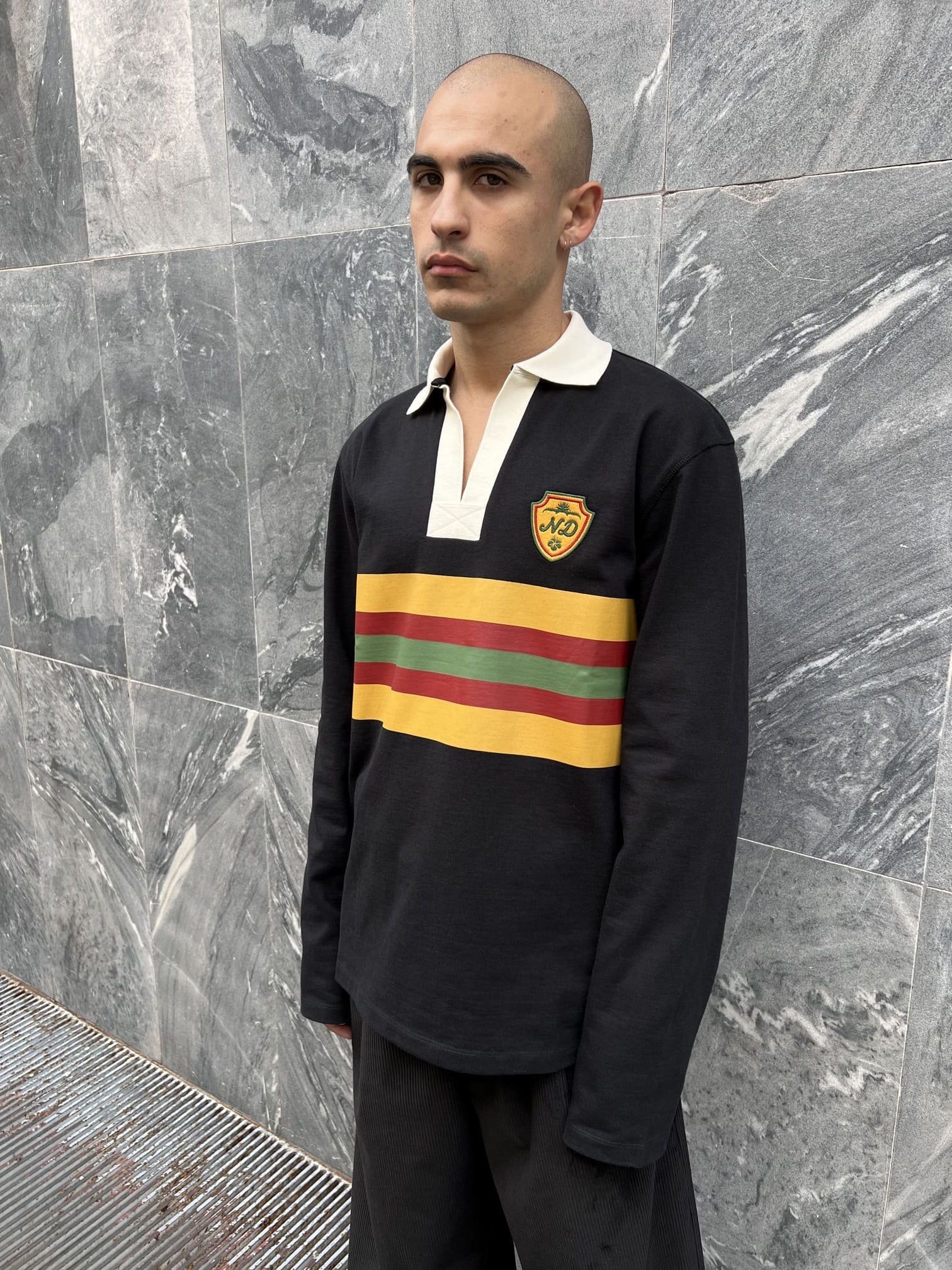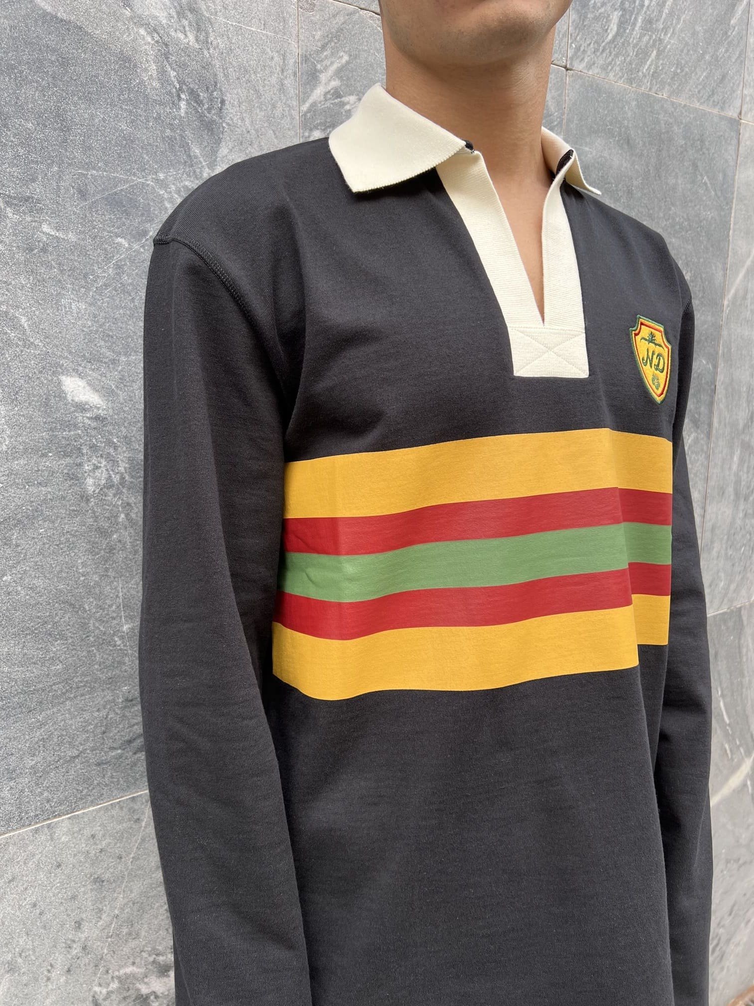 Heavyweight jersey with iconic red, green and gold stripe through the body made from 100% Cotton. Ecru ribbed collar and a v-neck placket. Embroidered "ND Shield" on the chest.