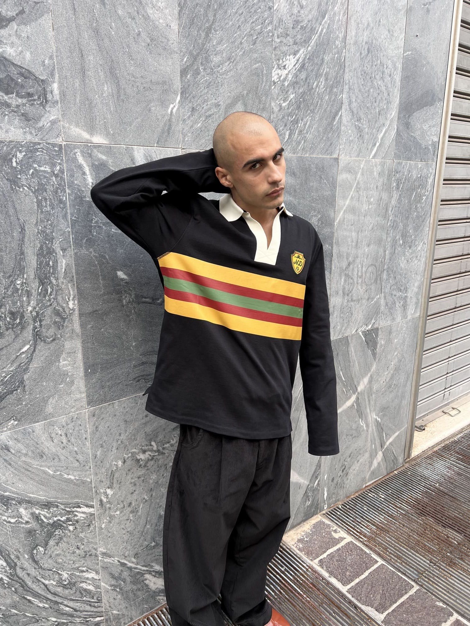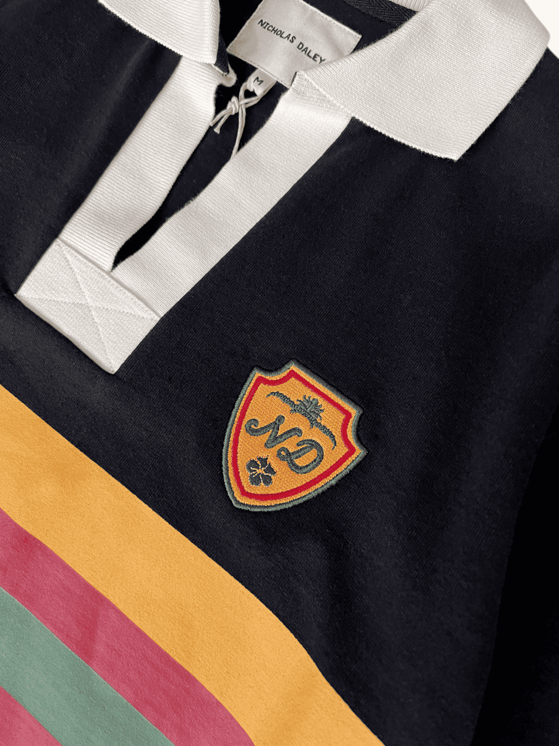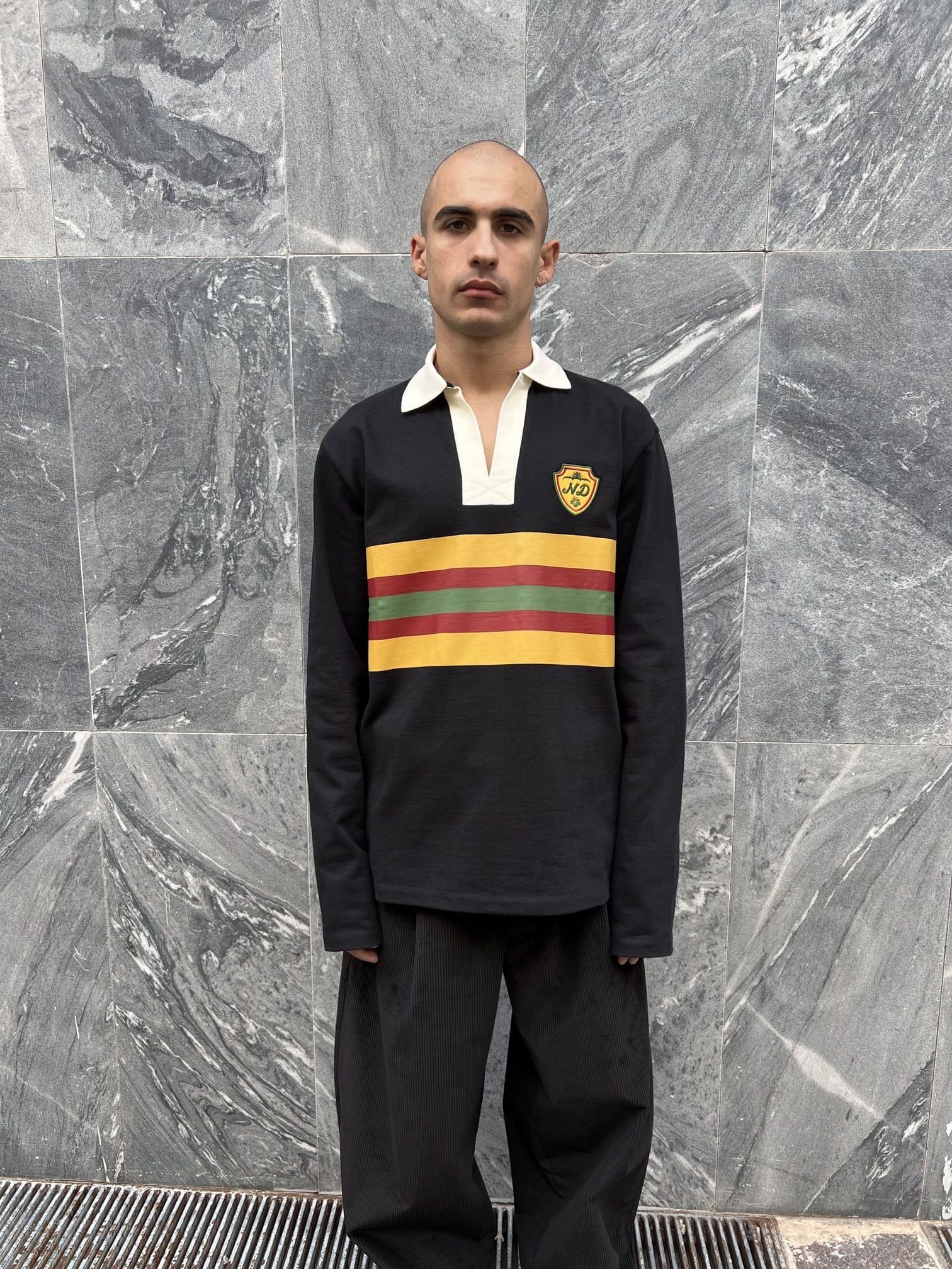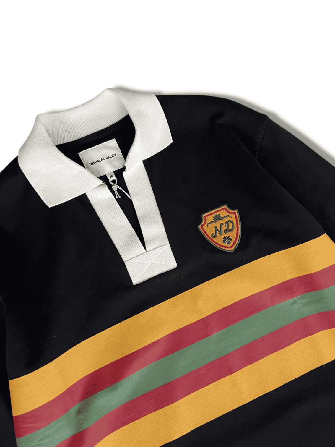 Heavyweight jersey with iconic red, green and gold stripe through the body made from 100% Cotton. Ecru ribbed collar and a v-neck placket. Embroidered "ND Shield" on the chest.