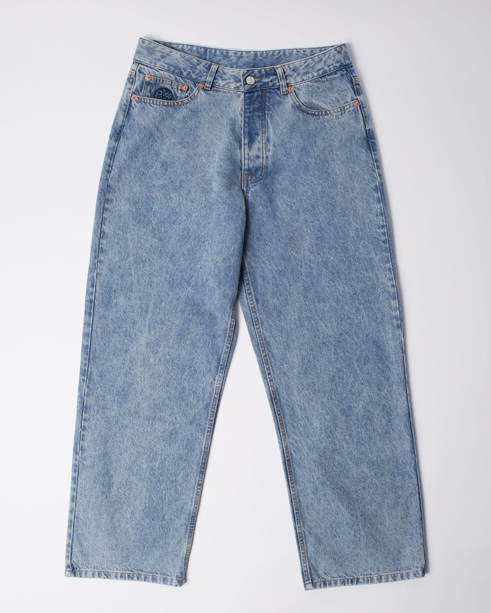 Stone-washed denim pants with an embroidered patch and logo embroidery on the coin pocket. Baggy, relaxed fit.